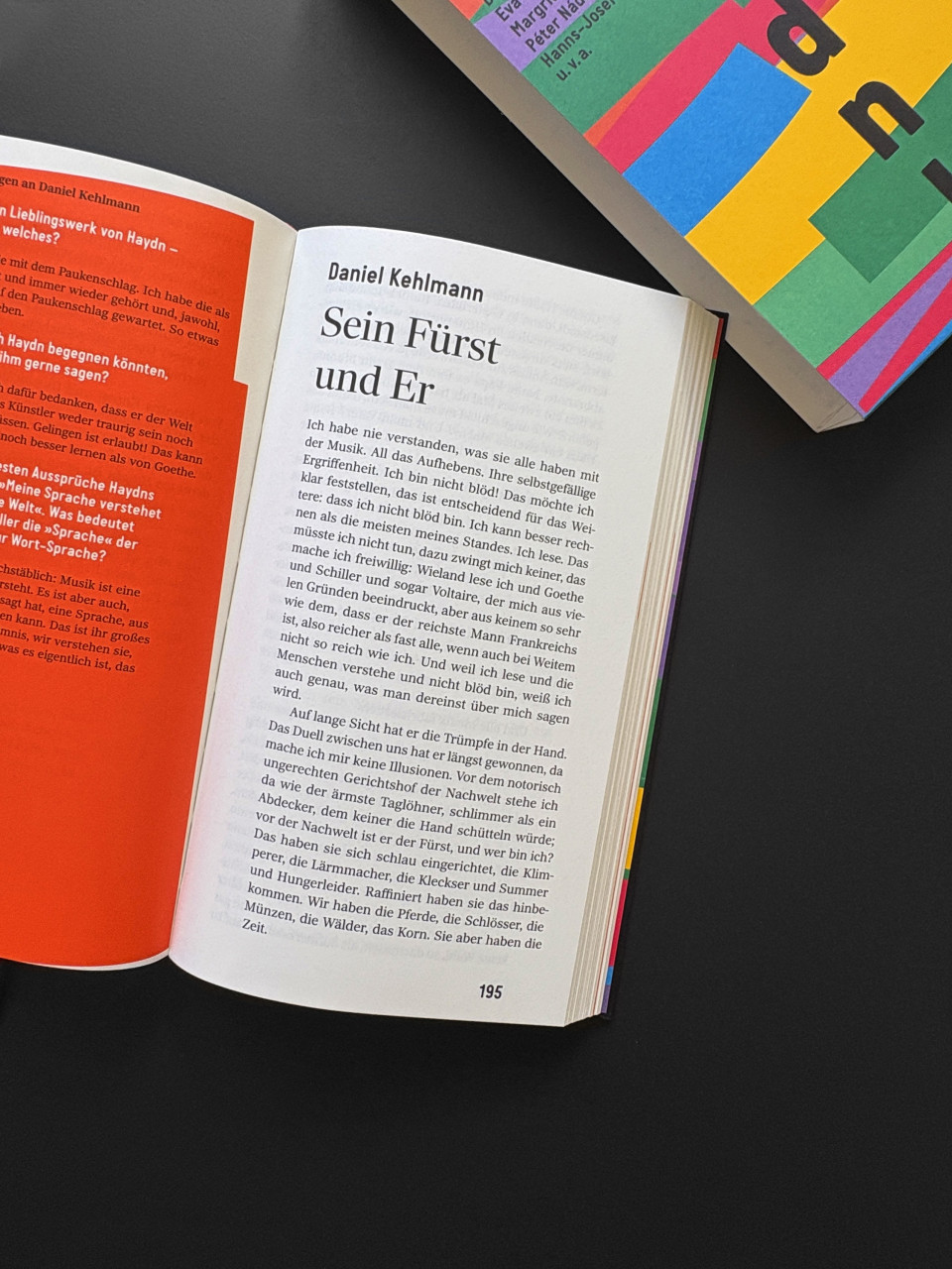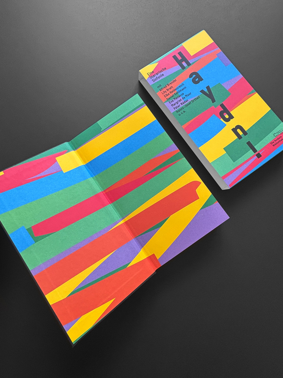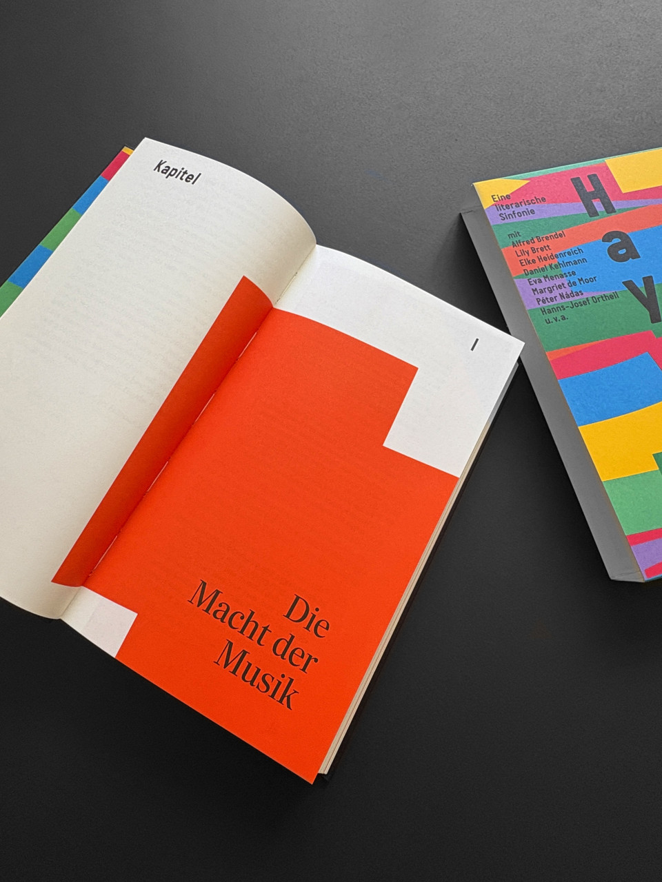 Design for a book about Franz Joseph Haydn featuring texts of Alfred Brendel, Lily Brett, Elke Heidenreich, Daniel Kehlmann, Eva Menasse, Margriet de Moor, Péter Nádas, and many others.